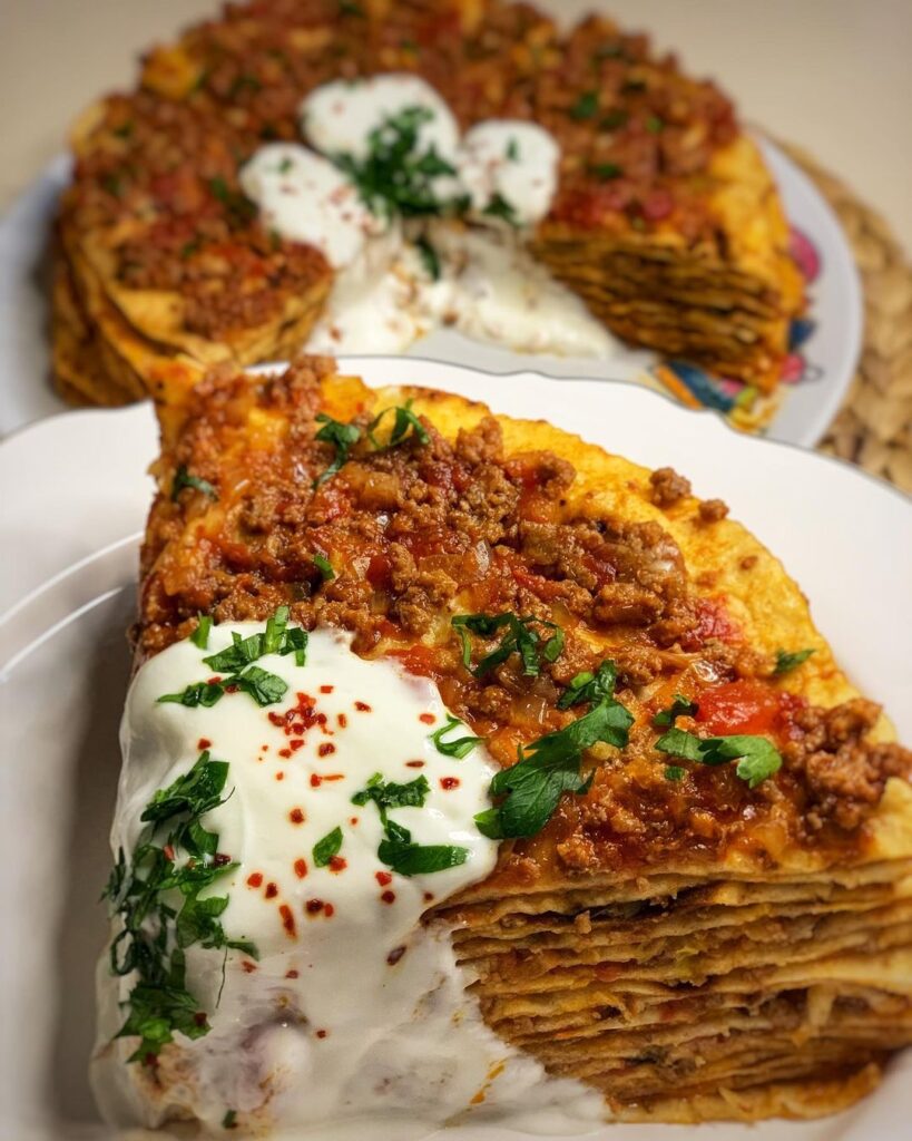 Servis tabağınıza bir adet pişirdiğiniz hamuru koyun ve üzerine kıymalı harçtan bir miktar yayın. Üzerine bir hamur daha koyun ve tekrar kıymalı harç sürün. Bu işlemi tüm hamurlar ve harç bitene kadar tekrarlayın. En üst kata da bolca kıymalı harç sürerek yağlamayı tamamlayın. Kat kat dizilen bu nefis lezzet, her bir lokmada farklı bir lezzet şöleni sunacak. - Servis: